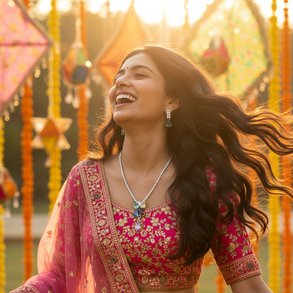 necklace with a multicolored, floral-inspired pendant and a single teardrop-shaped charm.